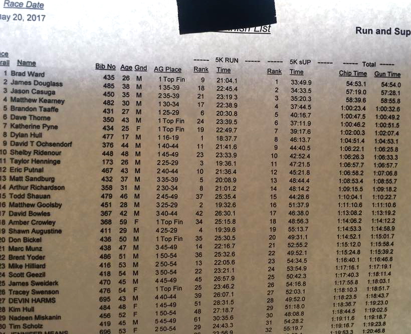 First place 12'6 man was Steven Miller (2:08:15), followed by Jamie Twigg (2:10:42), Packet Casey (2:14:55), [3 women], Robert Norman (2:25:42), [3 more women], and Matt Kearney (2:35:33).